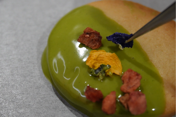 抹茶のクッキーに本格ホワイトクーベルチュールをコーティング。