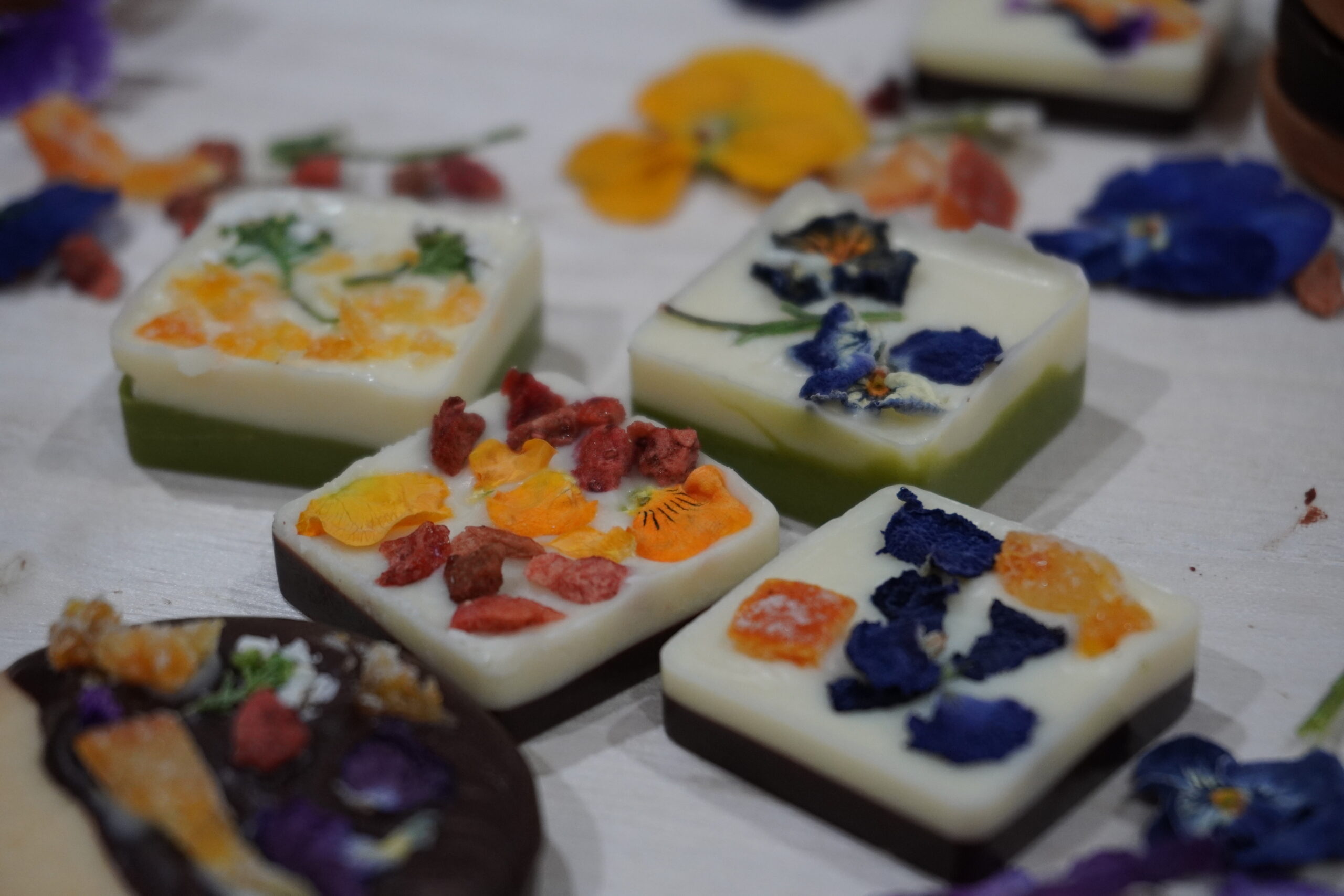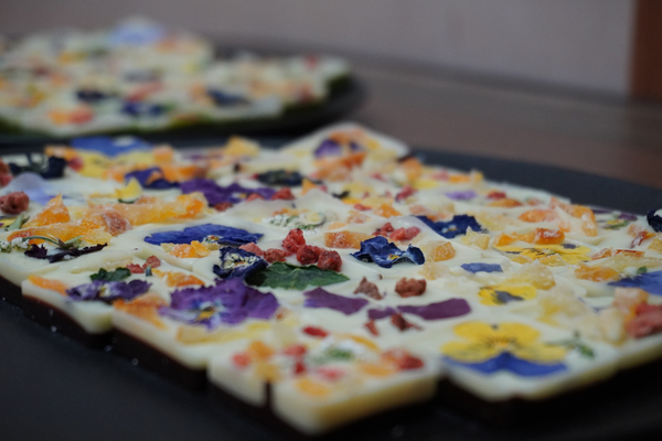 エディブルフラワーとドライフルーツをあしらった美しいアートのようなチョコレートです。